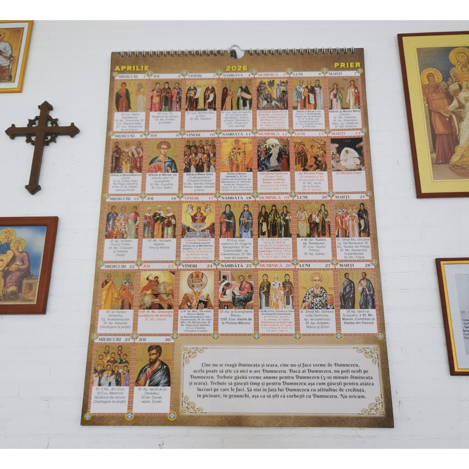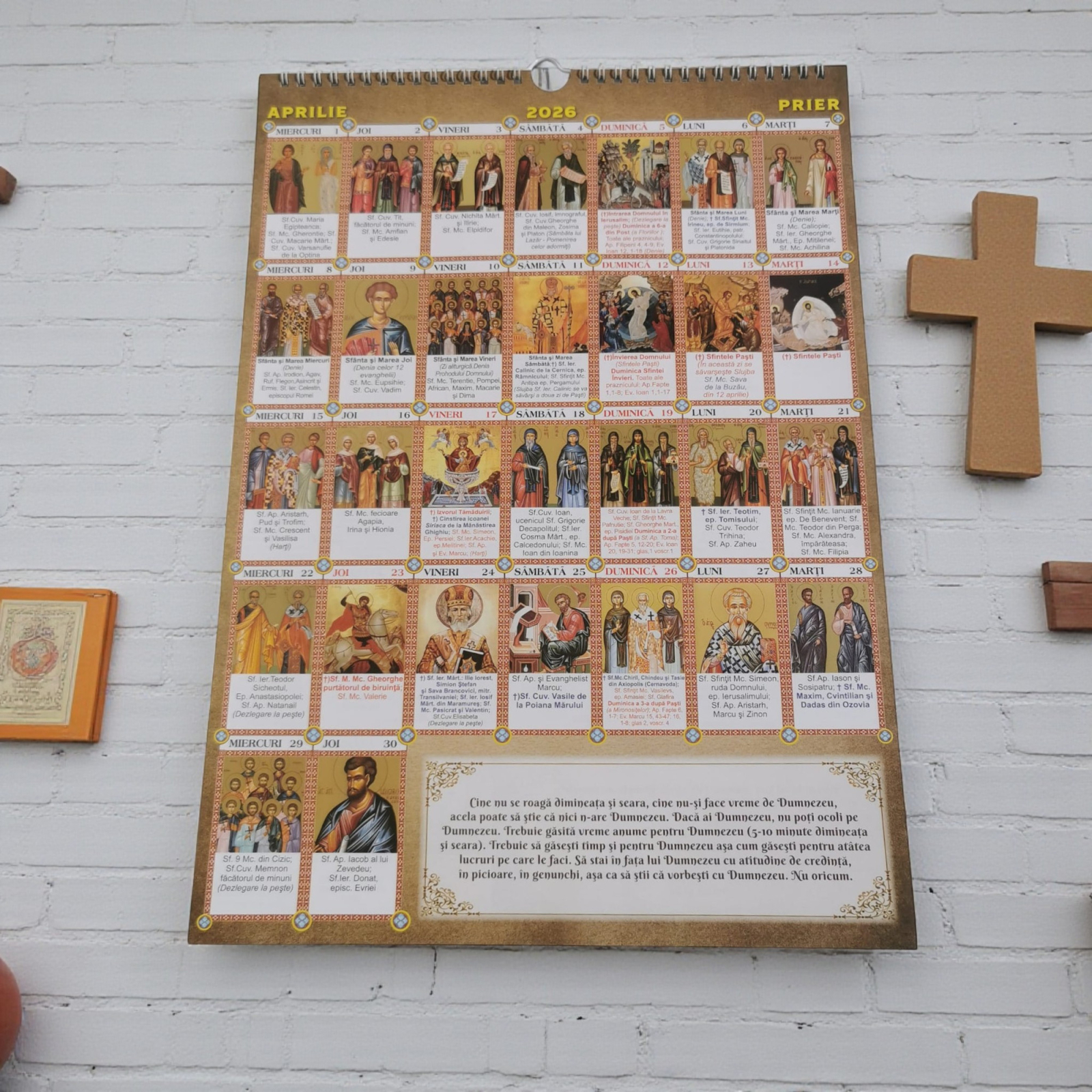 Acest calendar de perete va insoteste de-a lungul intregului an, oferindu-va pentru fiecare luna o imagine sfanta deosebita si informatii despre icoanele si sfintii pomeniti in fiecare zi. Cu un design luminos si plin de evlavie, calendarul aduce in caminul dumneavoastra frumusetea artei sacre si puterea rugaciunii.